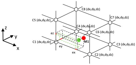 The basic task represents the calculation of the correction mesh, where the interpolation of correction values at the nodes compensate the evaluated error vector at the measured points. The correction value at any point in the workspace is calculated by trilinear interpolation [] from the correction values at the nodes