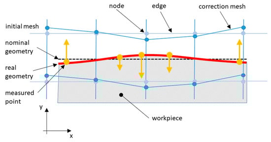Figure 2 shows a one-dimensional scheme in which real workpiece geometry is measured at five measured points in the Y-axis direction and the compensation data are calculated only in the Y-axis direction. The correction mesh consists of nodes where the compensation value is calculated and the edges connect two adjacent nodes. These edges are not part of the correction data, but are important for calculating node displacements.