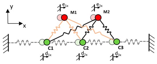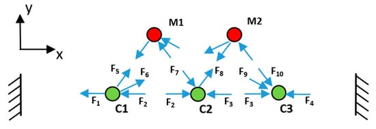 To maintain the force balance according to Figure 4, must apply for each node. The following system of equations can be derived for the displacement d1x, d2x and d3x of nodes C1, C2 and C3, respectively: