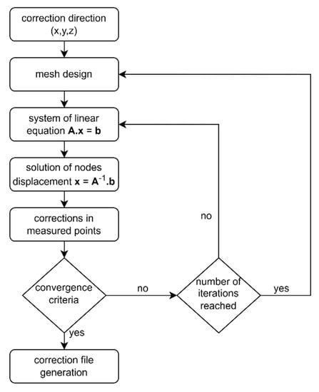 For each direction X, Y, Z, the displacement of the correction mesh nodes is solved separately. A set of linear Equation (5) is compiled for the node displacement calculations in the selected direction. The correction in the measured points calculated by interpolation from the nodes is not equal to the evaluated error at the measured points after this calculation. This difference is based on the connection of the measured points and nodes by flexible springs, except in the case when the measured point is identical with any node. By connecting the springs, the nodes always move less than the specified offset of the measured point. To increase accuracy, the proposed method includes an iterative algorithm; see Figure 5. A correction mesh with a defined dimension and a number of nodes is set up for the selected direction. From the knowledge of the position of the nodes and the measured points, the equation for the displacement of the node points (5) is compiled and calculated. The correction of the measured point is then calculated by interpolation from the calculated displacement. The difference between the evaluated and the required correction is added to the evaluated correction in the following iterative calculation.