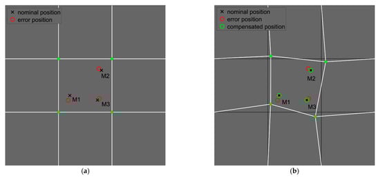 Numeric simulation of correction mesh calculation: (a) nominal position with an arbitrary error at every point; (b) compensated position evaluated from the correction mesh.