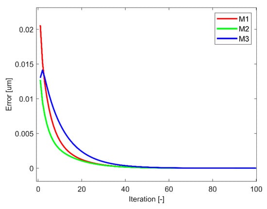 Three measured points with position deviations were positioned in the middle cell. To test the robustness of the proposed method, a deviation was defined with a different direction at each point: The calculated correction mesh after 100 iterations is shown in the Figure 7b, where the deviations are 100× magnified. Convergence of the difference between the nominal and reconstructed positions of the measured points is presented in Figure 8. Although three measured points in one cell had prescribed nearly opposite position deviations, the position was reconstructed with an accuracy of more than 99.98% for all points.