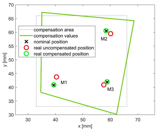 where gp1, gp2 and gp3 denote a position in the three-dimensional grid of input axes and compval1, compval2 and compval3 the deviations in that position for output axes. An example of the *.spf file is in the Appendix A, where the file structure is explained in detail. In accordance with the proposed method, the compensation data in each axis may be defined with a different number of nodes. The principle of calculating the correction value is based on interpolation in a three-dimensional mesh of compensation values that is integrated directly into a real-time core. However, detailed information about this calculation is not available in the documentation. Therefore, in accordance with the numerical simulation, a correction mesh with 3 × 3 cells was chosen, where the three selected test points lay in the middle cell of this network. At these points, a deviation from the desired position in the directions of the X, Y axes was prescribed for points M1, M2 and M3, respectively. These deviations and nominal positions were used to calculate the correction network and for compilation of the *.spf file for the control system. Next, the machine tool was positioned to the measured points, where the current compensation value was read from the control system. The results are shown in Figure 9, where the deviations are magnified 100× for clarity, and it is clear that there was a significant reduction in positional deviation. Specifically, the positional deviation was reduced by 96%, 92% and 94% for points 1, 2 and 3, respectively. These results show that the control system calculates the correction correctly. Refinement of the correction mesh to place each measuring point in a separate cell will produce even better results. However, in the selected case, the compensation error was already 1.2 μm, 1.1 μm and 1.2 μm for points M1, M2 and M3, respectively. All these values are considerably superior to the achievable accuracy of the selected machine tool.