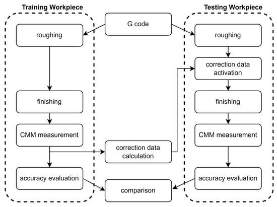 A machining test was performed on a three-axis machining center to verify the proposed method on a real part, and it is shown in Figure 10. Aluminum material AL7075 was chosen, and the tool used for machining was D20 mm solid carbide head with three flutes with 40° different helixes for aluminum machining. The tool was mounted in a hydraulic expansion tool holder with the interface ISO SK 50. The geometry of the designed part consists of linear and circular sections, and its technical drawing is provided in Appendix B. The NC program was developed in CAM software Siemens NX 12. A flow chart of the experiment is shown in Figure 11 and consists of two parts: the training and testing phases. The aim of the training phase was to evaluate the accuracy of machining without the proposed method and to calculate the correction data. An identical tool was used for roughing and finishing, where the cutting conditions are given in Table 1, and they were set with accordance to the tool manufacturer’s recommendation. To increase the surface quality, Cycle 832—High Speed Settings was activated in the control system in the form CYCLE832(0.03, FINISH,1), i.e., tolerance of 0.03 mm was prescribed for finishing for a program without orientation of the tool. After the final machining, the training piece was measured on a Coord3 coordinate measuring machine with a Renishaw SP25M scanning probe; see Figure 12. The deviation of the real geometry from the required one is plotted in Figure 13a, and it reached 0.098 mm.