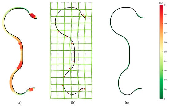 The Renishaw SP25M scanning probe measured 2480 points along the shape. Measuring with a scanning probe is a privilege of high-tech CMM, while touch-trigger probes are standard tools for CMM. Alternatively, if the measurement was performed directly on a machine tool, scanning-probe utilization would also be difficult. Therefore, only 21 points were selected manually to calculate the correction mesh. These points are located with respect to contour error distribution, where in the zones with higher deviations, more points were selected. Especially in the smallest inner radii, the errors reached the maximum and denser discretization was used there. The distance from each measured point to the nearest other one was calculated, and the mean value of these distances defined the mesh density. The resulting mesh has 6 × 14 × 1 cells in the directions of the X, Y and Z axes and is shown in the graph in Figure 13b, in which the selected measured points are also shown. The calculation of the correction mesh converged rapidly, and 96 iterations were enough to reduce the deviation by more than 98%. The total time of calculation in Matlab was less than 10 s, but it is worth stating that the algorithm is ready for optimization. The correction mesh must be defined in the global machine coordinate system, even if coordinate system transformation is activated for machining.