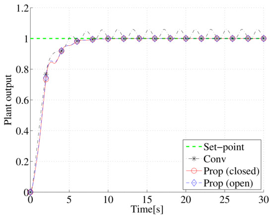 To demonstrate the effectiveness of the proposed closed-loop-based method, two types of plant are controlled, namely stable and unstable plants. In the simulation, the reference input is given by set-point 1, and the holding and sampling intervals are set as 1 s and 2 s (), respectively.