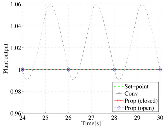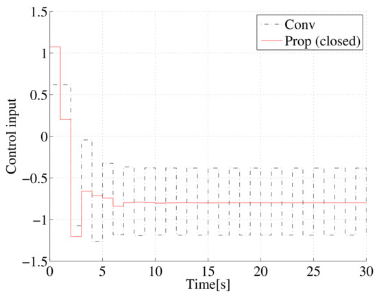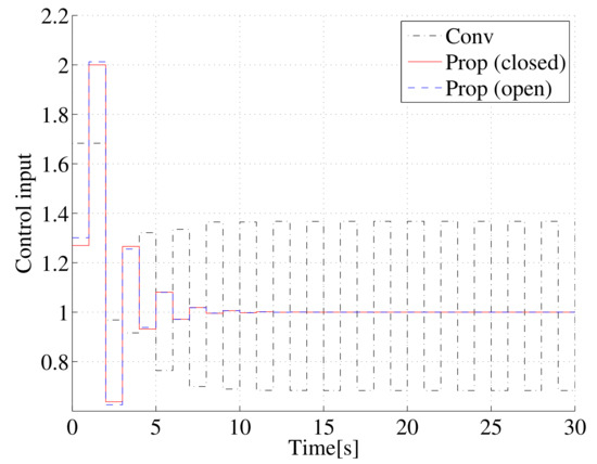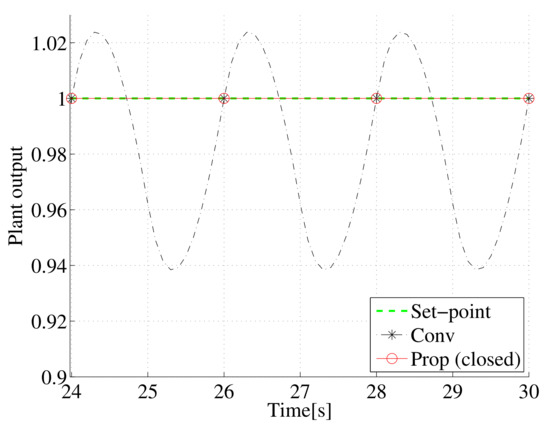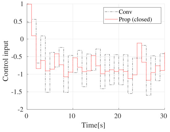 Equation (29) shows that is designed as a constant. The control result obtained using the proposed closed-loop-based extension method is also shown in Figure 5, Figure 6 and Figure 7, where the output and input trajectories are plotted by the red solid lines, and the sampled output trajectory is plotted by red ‘∘’ symbols. It can be seen that the intersample output as well as the sampled output converge to the reference input without intersample ripple. Furthermore, the sampled output response obtained by the conventional non-extension method is maintained in the steady state even though the trajectories of the control inputs obtained by the proposed and conventional methods are quite different.