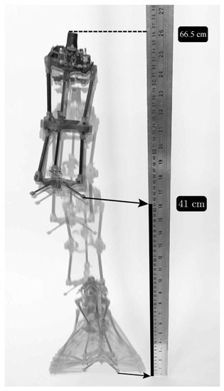This three-legged robot’s jumping mechanism was inspired by the frog and improved by adding one more leg to make it have greater jumping ability. Due to the lack of landing buffer, its hard landing made it impossible to land stably, so it has to be reset in order to prepare for the next jump. This paper is inspired by the frog’s landing, as the anticipatory hindlimb flexion of the frog during the aerial phase is a critical feature for mechanically stable landing [4], so this robot may also flex its legs during the aerial phase to make it have a stable landing buffer. The tendons of many animals not only store energy of locomotion in the form of potential energy when standing, but also play an important role at touchdown [5]. The elastic tendons in legs can deform to absorb the landing impulse shock, and the energy stored in deformed tendons can be reused for the next jump. The tendons work as power amplifiers and achieve metabolic energy conservation. Chen et al. studied locusts’ land buffering mechanism; Romano et al. studied the relationship between locusts’ legs postures and body displacement through kinematic analysis, and proposed that multiple elastic legs can reduce the maximum contact force, increase the energy absorption per distance, and achieve better landing buffer [6,7,8]. For the single-legged continuous jumping robot KenKen [9], its leg acts as both jumping and landing leg, which can absorb part of the landing shock and store energy. The elastic spring placed in its legs works similarly to tendons in real animals’ landing. By changing the leg posture in the air, the leg spring can absorb a large impulse at touchdown and store energy for the next jump. This method of changing leg posture in the air can be applied to improve the landing buffer of the three-legged jumping robot, while also storing energy for the next jump.