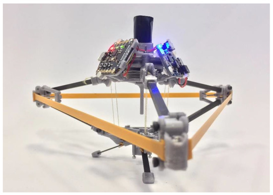As shown in Figure 2, the three legs of the robot connect the upper and lower body. By imitating the design of Hale’s robot, on the upper body, the motor is at the very top, and the gearbox that amplifies the torque of the motor is fixed under it. Unlike Hale’s robot, the upper and lower bodies of this robot are connected by a few thin wires instead of a power screw. One end of the ropes is wrapped around a winch below the gear box, and the other end is fastened to the upper part of the lower body. The stick under the winch is used to trigger the mechanism that separates the upper half of the lower body. The upper part that fixed ropes is locked on the lower body during compression and is separated from the lower body after the separation mechanism is triggered. All the components of the electronics are fixed around the upper body, which include an Arduino Bluetooth 4.0 Board, a 9-Degrees-Of-Freedom absolute orientation inertial measurement unit, a lithium polymer battery, and power management electronics.