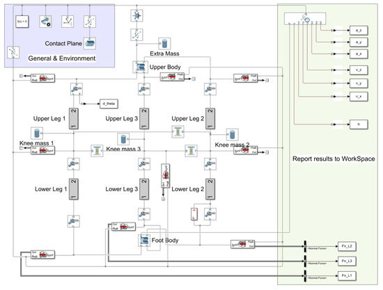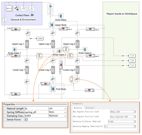 As shown in Figure 4, the output channels of the model are distributed in the green area on the right, and the data of the robot’s velocity, acceleration and height and the forces on the three legs are reported to MATLAB WorkSpace.