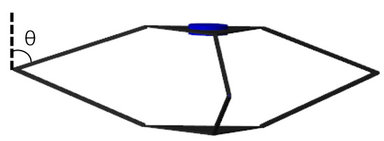 As shown in Figure 5, the simulation model retains the main features of the jumping robot and simplifies the parts that are irrelevant to the robot’s dynamics. Both the simulation model and the jumping robot consisted of three legs, communicating an upper and a lower body section. The elastic strap attached to three middle-leg hinges was replaced by three invisible springs with the same stiffness in the simulation model. Each hinge was simplified to an equivalent point mass in the knee joint. The upper and lower bodies were simplified into two triangular plats of the same dimension. The mechanical power system for the upper body was simplified as a cylinder with the same mass and similar dimensions. The three landing legs under the lower body were ignored. To simplify the jumping rover model while still establishing a fairly accurate model as much as possible, several assumptions have been made. The physical structure of the jumping rover is a rigid frame, so that its elastic vibration and deformation are not considered. The aerodynamic effects, such as air resistance, were not considered. The internal friction of the robot is ignored, such as the friction between the joints. Since the energy accumulation process does not participate in the simulation of jumping and landing, the simulation prototype omits it, in order to simplify the simulation model, so the simulation of the robot starts from the compressed state, ready to take off. To define the compressed state of the robot at the start of the simulation, the acute angle formed by the upper or lower leg and the vertical is defined as the squat angle, which is the θ in Figure 5.