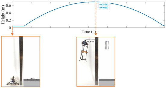 After the simulation results are reported to the WorkSpace by the output channels, these data can be analyzed in different ways. Figure 6 shows the resulting curves of height reached by the robot versus time, plotted from the data output from the simulation prototype. As can be seen from the comparison photos at the beginning, at the start of the simulation, the robot was already compressed and ready to take off. Before the simulation was started, the robot was input with a squat angle of 80 degrees, which was close to the experimental squat angle in the compressed state. In this way, the robot in the simulation could be considered to obtain the same energy accumulation as the experimental robot. Another comparison photo was taken when the robot reached the highest point. It can be seen that the highest point reached by the robot in the simulation was 0.6968 m and the highest point in the experiment was 0.665 m, so the deviation rate was 4.78%. The deviation rate is acceptable, so the simulation model prototype proved to be credible.