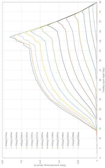 Figure 8 shows the resulting curves of the elastic potential energy absorbed at different landing squat angles and there are 15 curves, representing 15 drop heights (the legend describes the corresponding launching squat angle and drop height of each curve). Taking the 80 degrees launching squat angle as an example, the values at the beginning of the curve are very small and close to 0, then the curve increases first and decreases after reaching the peak. In the process of increasing, the slope of the curve first becomes smaller and then becomes larger, and the slope is almost unchanged in the process of decreasing. The other curves share the same characteristics, and when the drop height is higher, the best landing squat angle is smaller, and the maximum landing energy absorption is greater.