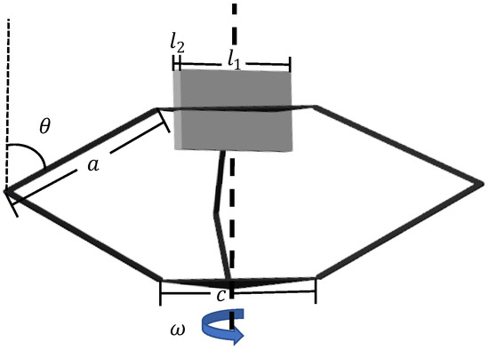 After releasing, the data of the energy absorbed during the landing was collected, so that the change in the landing energy absorption after applying IAT could be obtained. It is worth noting that after the initial angular velocity was applied, the energy input for take-off had increased. Without considering the energy loss, the input energy that made the model rotate equaled its rotational kinetic energy. Therefore, the rotational kinetic energy of the model at the certain initial angular velocity needed to be identified. As shown in Figure 9, the basic parameters of this structure are the leg segments a, the leg–body articulation distance c, the squat angle θ, the cuboid’s length l1, the cuboid’s width l2 and the initial angular velocity ω. The rotational axis and direction are displayed. The derivation of the total moment of inertia is as follows.