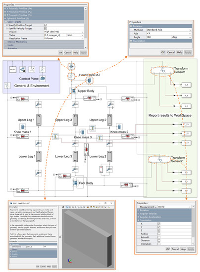- To prevent the robot from decompressing during the fall, the landing squat angle was limited from a certain input landing squat angle to 80 degrees, though the Rotational Hard Stop Friction block marked in Figure 7.