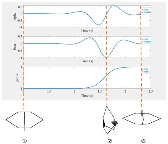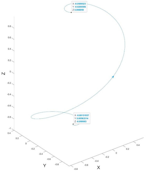 In the simulation, an initial rotation speed was added to the robot. The rotation speed that could make the robot flip once in the fall and land with a vertical attitude was what needed to be obtained in this simulation experiment. Since the attitude vector is a unit vector, if the robot lands vertically, the direction cosine is 1 on the X and Y axes, and 0 on the Z axis. This initial rotation speed was tried from the input of 0 rad/s and the landing direction cosines of the robot were observed. We tried increasing the rotational speed and running the simulation repeatedly until the required speed was tried out.