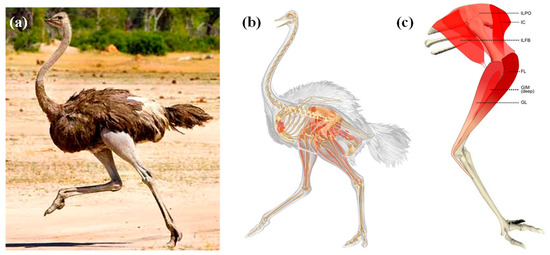 As the fastest biped running on land, the ostrich has strong and powerful lower limbs and has the ability for steady, lasting, and high-speed running [9] (Figure 1). The ostrich weighs 100 kg, with a continuous running speed of about 60 km/h, a sprint speed of more than 70 km/h, and can last for about 30 min [10]. Ostriches have such obvious advantages in speed and energy saving, partly because of their unique leg and foot structure [11]. The muscle at the root of the ostrich’s thigh accounts for 80% of the weight of the whole lower limb [12], which can reduce the moment of inertia of the ostrich’s leg during movement and facilitate the rapid change of its speed. In addition, the length of the ostrich’s calf bone is similar to that of the thigh bone, and there are few muscles in the knee and calf. Therefore, the leg has a large folding/unfolding ratio. What is more, the distance between the two legs of an ostrich is four-fifths of its body width; this ratio makes it difficult to fall when the upper body swings from side to side.