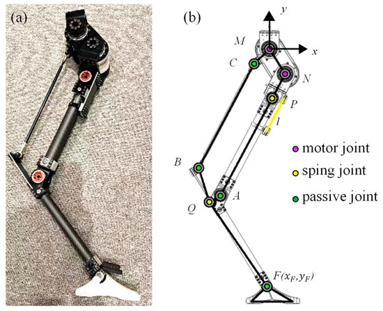 The leg is an important part of a robot and plays a very important role in the movement of a legged robot [14]. According to the principle of engineering bionics, the superior performance of the ostrich leg can be applied to the design of a biped robot leg structure. The single leg designed in this experiment is shown in Figure 2. Two motors are set at the hip to simulate the hip and knee joints of an ostrich. The hip motor (M) is mainly used to control the swing of the leg. The knee motor (N) is mainly used to control the expansion and contraction of the leg. In order to imitate the tendon of the thigh, an additional joint is set at point P and constrained with a leaf spring to form the elastic joint, and BQ is also set as a leaf spring to reduce impact acceleration [15]. The center of mass (COM) of the whole leg is located at its root, which is similar to the mass distribution of the ostrich leg. In order to imitate the meniscus buffer structure of the ostrich knee joint, the output link of the driving motor for the toe joint is set as a leaf spring, so that the impact acceleration will be greatly reduced when the leg collides with the ground. In addition, the energy stored in the leaf spring can help the bionic leg take off from the ground during running [16]. In terms of leg length distribution, following the leg size of an ostrich, the length ratio of connecting rod AF to AN is set to 0.75.