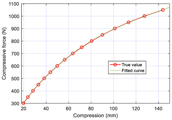 Different from active compliance control [17], this mechanism improves the buffering properties through passive compliance. The material 65 Mn spring-steel is selected for the two leaf springs P and Q, thus the elastic moduli Ep and Eq are both 197 GPa, and the compression force range is from 300 N to 1300 N. This loading range is employed here because the weight of a single bionic leg is 17 kg. Considering the jump gait during rapid movement, the maximum impact force is more than 300 N. As shown in Figure 3, the equivalent elastic modulus () of the leg, i.e., the change rate of the compressive force to compression, decreases during the process of compression. The data fitting of the equivalent elastic modulus is shown in Formula (10), and the fitting error is 2.679, indicating that the ability of the spring leg to store elastic properties is nonlinear and decreases with the increment of compression.
