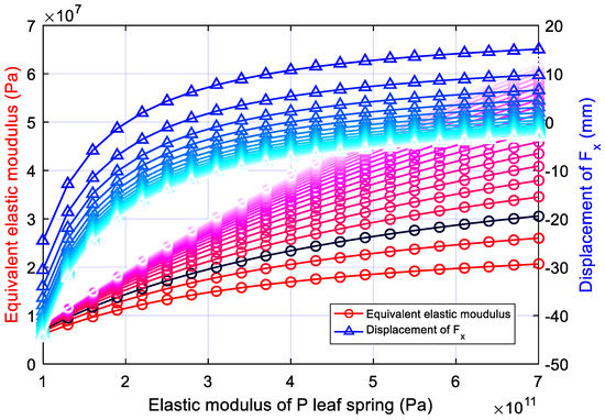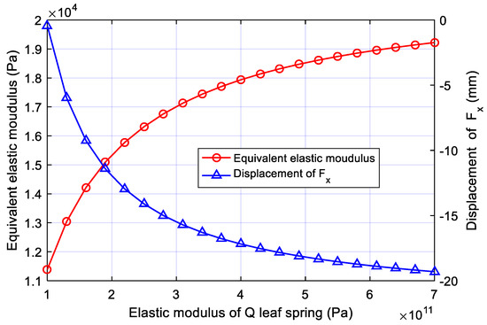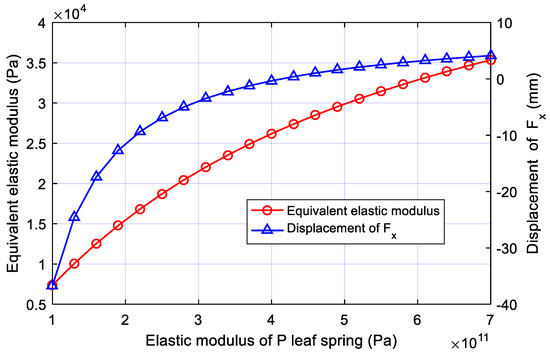 - For a single leg with an initial length of 800.9 mm and a compressive force of 300 N, the equivalent elastic modulus of the structure () and the displacement of point F in the x-direction (Fx) also increases with the increase of the elastic moduli of the P and Q leaf springs, and the rate of change decreases with the elastic moduli of the leaf springs.