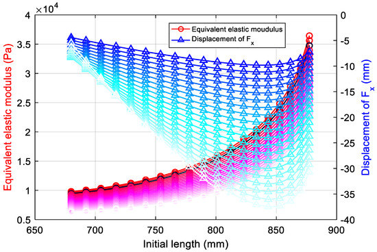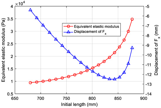 In order to analyze the influence of Eq on the equivalent elastic modulus of the spring leg, we set Ep = 197 GPa and initial length = 800.9 mm (Figure 5). The value range of Eq is 100–700 GPa and the elastic modulus of few materials exceeds 300 GPa. Here, it is extended to 700 GPa to analyze the trend of change. The results show that both the equivalent elastic modulus and the displacement of the F point of the structure increase with Eq, and the rate of change keeps decreasing.