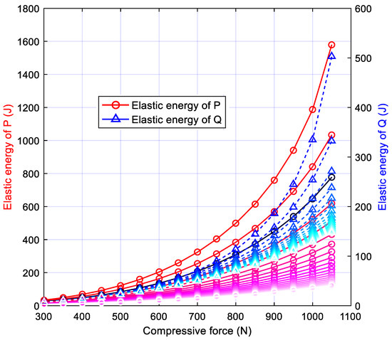 The influence of Ep and Eq on energy storage is reflected in the rotation angle of the leaf spring under compression. The stored energy increases with the increment of the rotation angle. Therefore, the change of energy stored in the leaf spring with compression force is calculated according to Formula (1):