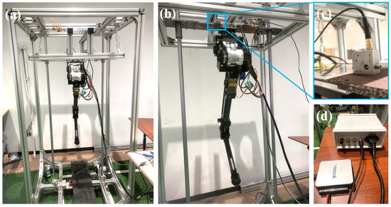 Impact acceleration detection device: (a) the single leg assembled on the test platform, (b) an enlarged view of the single-leg installation, (c) the acceleration sensor, and (d) the power supply and data acquisition system.