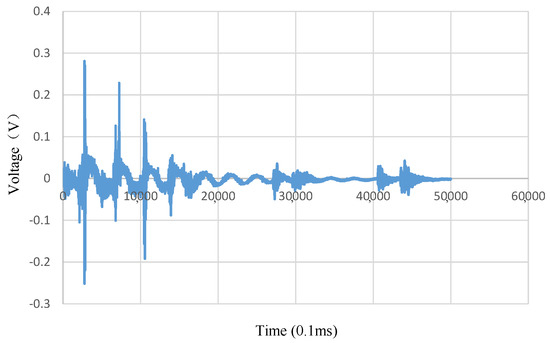 The motor was powered to maintain its designed behavior after the fixing of the leg. The leg was let down from a height of 10 cm and the impact acceleration was measured at the upper end of the movable table. The data measured by the sensor is illustrated in Figure 11. According to the analysis of the data results, the frequency of the impact wave is about 3 Hz, which is very low due to the buffering of the leaf springs. The measured value of the first wave peak is 0.04 V, indicating that the impact acceleration is about 2 g, which is close to the calculated value. There may be two factors responsible for the prediction error: (1) connection mode, the leaf spring is connected to the fuselage by screws, thus the actual action length of the leaf spring is uncertain; (2) the complex stress state of the leaf spring is simplified as a plane force state in the model, however, it will be subjected to the force along the width direction under actual conditions, which can affect the prediction results of the model to a certain extent.