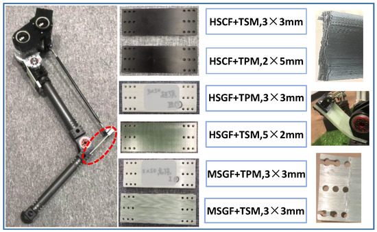 The leaf spring is an important flexible part of the mechanism. If the elastic modulus of the leaf spring is extremely large, it would not have an ideal buffering effect, while a too-small elastic modulus would worsen the control accuracy. The mechanical properties of spring steel are most suitable for the requirements of this experiment, however, its determination is high density. Therefore, several fiber-reinforced composites were tried as illustrated in Figure 12, including high-strength carbon fiber-reinforced thermosetting composites (HSCF + TSM), high-strength carbon fiber-reinforced thermoplastic composites (HSCF + TPM), high-strength glass fiber-reinforced thermosetting (HSGF + TSM) and thermoplastic (HSGF + TPM) matrix materials, and medium-strength glass fiber-reinforced thermosetting (MSGF + TSM) and thermoplastic (MSGF + TPM) matrix materials.