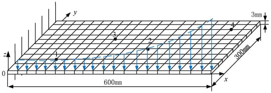In order to verify the effectiveness of the proposed method and to show its relevant details, a rectangular plate finite element model, as shown in Figure 2, is established. The length, width, and thickness of the model are 0.6, 0.3, and 0.003 m, respectively. The density of the material is , the elastic modulus is 7.0 × 1010 Pa, and the Poisson’s ratio is 0.3. The damping is set as proportional, and the coefficients that are related to the mass matrix and the stiffness matrix are 0 and 9.0 × 104, respectively. As shown in Figure 2, the left edge of the plate is fully fixed, and the time and space independent distributed random dynamic load acts vertically on the plate’s front edge. Its spatial distribution function has the form of , . The median function and the interval radius of its time history are assumed as , and 0.3, respectively. The self-correlation coefficient function is , and the sampling time interval is 0.001 s.