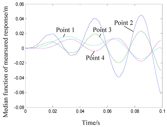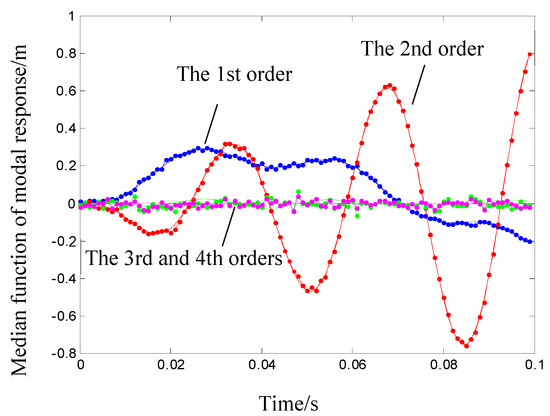 In the following, the equivalent load median functions are first identified on the basis of the response median functions. Via modal analysis, it is determined that the modal truncation number is 4. In order to reverse the first four orders of the modal responses in the case of a positive definite, four measuring points, as shown by the black dots in Figure 2, are selected. The median functions of these measured displacement responses are calculated and are shown in Figure 4. By implementing inverse modal transformation, the first four orders of the modal displacement responses are calculated, which are shown in Figure 5. It is not difficult to find that the third order and the fourth order of the modal responses are already very weak, which demonstrates that the modal truncation is effective. Under each mode, the modal load is stably identified on the basis of the Green’s kernel function method and regularization. By calculating the signal-to-noise ratio (SNR) of the identified modal load, the identified second order of the modal load () is selected as the equivalent median function of the time history of the distributed random dynamic load, as is shown in Figure 6a. It can be observed that the identified modal load is high, which is consistent with the actual one. According to Equation (23), the weight coefficient vector () is calculated. Then, by performing the OMP algorithm with the threshold set as 0.005, the sparsest solution of the load spatial distribution function is obtained, as is shown in Figure 6b. It can be seen that the original continuous spatial distribution function is sparsely represented as two non-zero values at the positions of 0.33 m and 0.6 m. By applying the two identified concentrated dynamic loads to the corresponding positions of the structure to generate structural responses, as is shown in Figure 7, the three randomly selected structural responses by the two equivalent loads are quite consistent with the ones that were aroused by the original distributed load, which demonstrates the rationality of the equivalent sparse identification of the load median function.