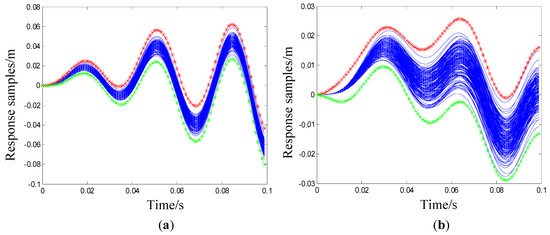 In this paper, by sampling the time history of the load, as shown in Figure 3, samples of the distributed random dynamic loads are obtained, and then these sample loads are applied to the plate structure, one by one, to calculate the corresponding response samples. The sampling of the load time histories is achieved by means of K–L series expansion. Because the time history can be expressed as a series superposition form that contains only standard interval variables as Equation (9), via truncation and the sampling of the standard interval variables (), the time history samples can be achieved. Moreover, in order to simulate the real measurement environment, a certain level of noise is mixed into the calculated response, according to Equation (40). Finally, the median function and the covariance matrix of the 200 response samples under sample loads are approximately calculated: