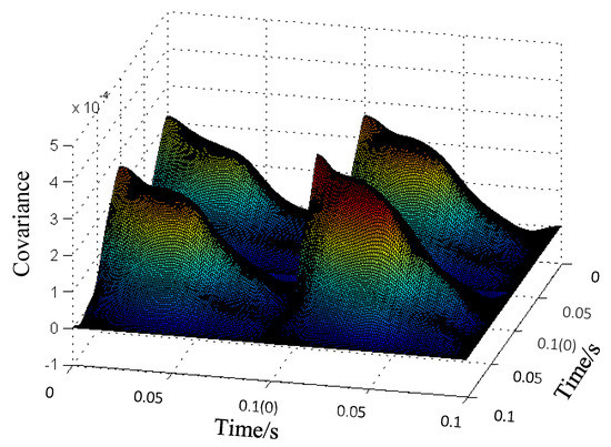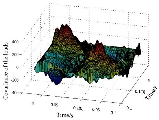 According to Equation (5), the self-correlation coefficient functions of the loads are calculated by using the smoothed radius functions. Generally, when the self-correlation coefficient function of the excitation load is only related to the time intervals, the one with the response of a linear time-invariant structure is also a function of the time interval, in theory. Considering that there is a certain error in the identified load covariance matrix, the covariance of the same time interval in the matrix is not exactly the same. In this paper, all of the correlation coefficient values with the same time interval are averaged by performing Equation (41), and the approximation of the equivalent load self-correlation coefficient functions are obtained, which are shown in Figure 13 by the red and blue dotted lines. In this example, because the spatial dimension and the time dimension of the distributed random dynamic load are assumed to be independent of each other, the self-correlation coefficient functions of the two random concentrated dynamic loads that are identified equivalently should be consistent with the one of the original distributed load. By comparing the self-correlation coefficient function (blue solid line) of the original load time history with the ones of the identified equivalent loads, it is found that the three curves are quite similar. In order to verify the effectiveness of the identified correlation coefficient functions, a new load covariance matrix is calculated according to Equation (6) on the basis of the correlation functions in Figure 13 and the radius functions in Figure 11, and the covariance matrix of the same two measuring points is calculated through the forward model of Equation (36a), as is shown in Figure 14. By comparing Figure 14 with Figure 9, it is found that they are quite consistent. The overall relative error between them is only 8.34%, which shows the effectiveness of the identification results.