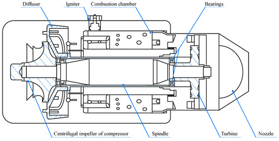 Figure 1 presents the schematic of a turbojet engine. The major components of the engine are illustrated. The air from upstream comes through the centrifugal impeller of the compressor and reaches the diffuser. Via both the axial and radial diffusing, the air enters into the combustion chamber by passing the airhole. The combustion process is triggered by the ignition of the igniter, with the air mixing with the fuel. Hereafter, the high-pressure and high-temperature gas expands towards the turbine, which provides power to drive the spindle, the turbine, and the compressor rotating at high speed. Subsequently, the gas goes into the jet nozzle at lower pressure and a higher speed. In this way, the thrust is produced whilst the exhaust is discharged to the atmosphere [21].