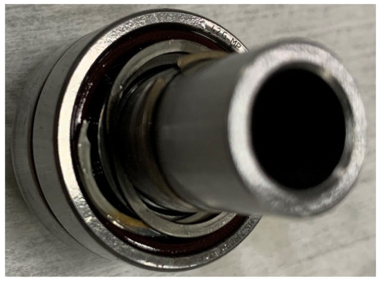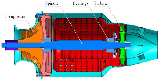 We shall thus detach the structure of turbojet engine to resolve the coaxial-rotor unit. According to Figure 2, regardless of the outer case, the coaxial-rotor unit consists of a spindle, the high-speed rotors, and the bearings. Apparently, in this system, the rotors are mainly the turbine and the compressor. Meanwhile, there is a ball bearing on each end of the rotor. Generally, the bearing is made up of high-speed ceramic with the inner and outer ring of bearing steel. An example of a coaxial-rotor unit is exhibited in Figure 3. The rotating speed of the coaxial-rotor unit is over 10,000 r/min, while the highest speed reaching 100,000 r/min. Due to the working principle of the turbojet engine, the bearings are set to protect the rotors and, in turn, are most likely to break down during working. Based on the previous investigations, the bearing failure is the most probable failure mode in practical use [22,23,24].