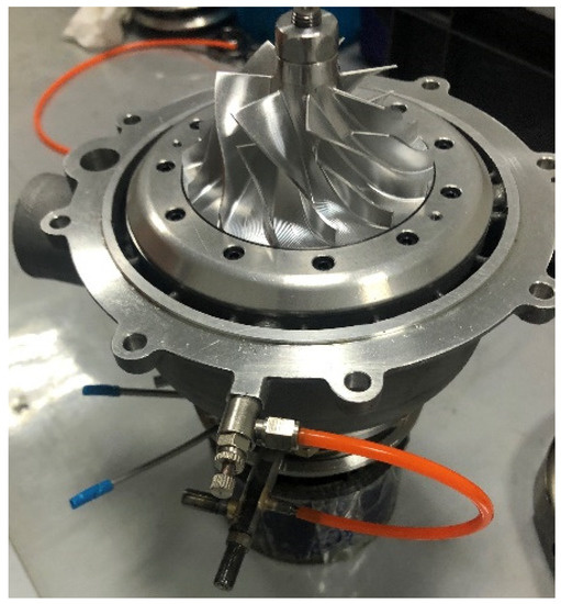 Sensing elements for detecting the working parameters are installed alongside the working components within the system. In the domain of measuring the rotating machinery, the vibration signal is most pronounced for characterizing the operational status directly. According to statistics, more than 70% of faults are manifested in the form of vibration [25]. In this way, to diagnose the potential faults, a three-axis vibrating acceleration sensor is attached to the rotor case. The specific installation position and sensor structure are shown in Figure 5c. The vibration of three directions—axial, radial, and tangential—is detected during working phases. With the power supplied, the vibrating signals are gathered by Integrated Circuits Piezoelectric (ICP) sensors 356A33 designed by PCB Piezotronics Inc. [26]. Sensing signals are transmitted through the 10-m low-noise cables. The data collecting and recording are implemented on an LMS830A analyzer. The measurement frequency is as high as 50 k Hz for dynamic signal detection. The signal acquisition time is 120 s and involves a whole work phase of the coaxial-rotor unit. The three-directional vibration signals are displayed in real time and kept for further analysis. In addition, a tungsten–rhenium thermocouple temperature sensor measures the temperature of the hot gas whilst a Hall speed sensor monitors the rotating. Figure 5 shows the photograph of the major components of the system. The specifications of the corresponding measurement devices are given in Table 1.