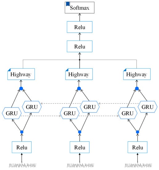 Aiming to identify the working state of the coaxial-rotor unit under different conditions, a fault diagnosis approach based on a Bidirectional Gated Recurrent Unit (Bi-GRU) and the Highway Network is proposed. The architecture of our model is presented in Figure 9.