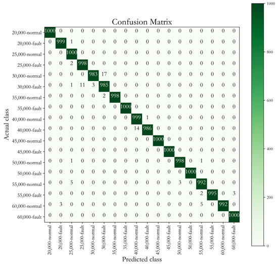 The fault diagnosis results of different rotation speeds are obtained. The test accuracy of all the working conditions is given in Table 3. The confusion matrix that presents test outcomes is shown in Figure 10. Notably, the values on the diagonal line refer to all the correctly recognized numbers of samples, corresponding to the accuracy of the test. The darker the color is, the higher the accuracy is.