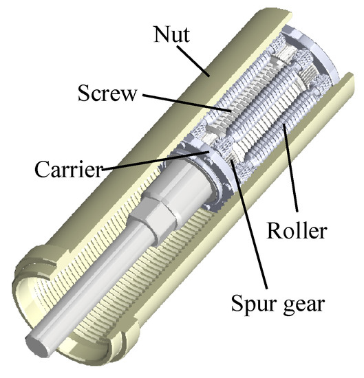 Compared with the pneumatic and hydraulic servo actuators, the EMA has the advantages of lightweight, high efficiency, convenient installation and maintenance, low operation cost, and no gas or liquid leakage [1]. Thus, the PRSM is widely used in aviation [2,3], aerospace [4,5], ships, vehicles [6], and medical and other fields. For example, the EMA in the thrust vector control system of the European ‘Vega’ launch vehicle used PRSM as its actuator, which successfully passed the tests of vibration, temperature, humidity, durability and vacuum [7]. In 1992, the PRSM was applied to Rolls-Royce aircraft engines and achieved an average trouble-free time of 8711 h [8]. The PRSM installed on the international space station was subjected to a lifetime test in the ESTL laboratory in Britain, which showed that all the samples met the requirements of five years of on-orbit fault-free work [9]. Research by the INSA/Toulouse laboratory in France showed that if the BSM in the EMA of the spoiler plate in a Boeing 787 was replaced by the PRSM, the total weight of the EMA would be reduced by 33% [10]. In addition, the PRSM has the advantages of easy installation, strong rigidity and good dynamic performance [11]. As a result, the PRSM has been applied to a variety of military and civilian products and equipment such as welding robots, electric-pneumatic hybrid actuators [12], machine tools [13], vehicles, ships, marine equipment, aircraft [14,15] and medical equipment [16,17].