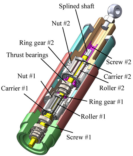 - Lisowski, F. The analysis of displacements and the load distribution between elements in a planetary roller screw. Appl. Mech. Mater. 2014, 680, 326–329. [Google Scholar] [CrossRef]