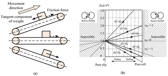 (a) Comparing the roller–screw with a box on a conveyor; (b) graphical illustration of slip tendency in Ref. [31].