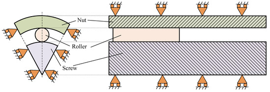 Lisowski et al. [41] created a finite element model of the contact of the single pair thread in the PRSM and obtained the stress and thread deformation curve. They also proposed a load model of the PRSM with reference to the direct stiffness method. Lisowski et al. [42] then analysed the load distribution of the PRSM under the influence of random pitch error and calculated the stiffness coefficient of the interactions between the screw–roller and the roller–nut using the finite element method. In addition, Lisowski et al. [43] proposed an optimisation of thread root undercut in the PRSM. Using a three-dimensional finite element (3D FE) method, Abevi et al. [44] proposed a sectorial model of the inverted PRSM involving an entire roller, as shown in Figure 8. The axial stiffness and the load distribution under both compressive and tensile loads were investigated, and complementary experiments were carried out to measure the axial deflection of the screw and rollers. The results showed that the external load was unequally shared over rollers and contacting threads, which was due to manufacturing and positioning errors.