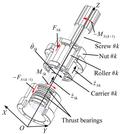 The research mentioned above mainly focused on single-stage PRSM. Based on the structural characteristics of the multi-stage PRSM, Li et al. [68] analysed the motion and force in and between the different stages (Figure 12). In Figure 12, FN(k−1) and FNk are the forces acting on the nuts at the (k−1)th and kth stages. MNk and MN(k+1) are the torques acting on the screws at the kth and (k + 1)th stages. The torques of the screw #1 (k = 1) and the force acting on the nut at the last stage are assumed to be given in Ref. [68]. and are the rotational and axial velocities of the screw #k. The axial velocity of the nut #k, , is given as