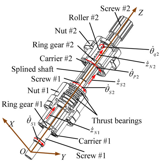 where LSk is the lead of the screw #k. The rigid-body motion equations of the multi-stage PRSM were derived by using Newton’s second law, and the method for solving the motion equations was given in Ref. [68]. The influence of the friction coefficients in and between the different stages on the dynamic characteristics of the multi-stage PRSM was discussed. In order to reduce the computing time, Li et al. [69] proposed an efficient dynamic model of multi-stage PRSM based on the Lagrange method. The structure and motion analysis of a two-stage PRSM in Ref. [69] were presented as shown in Figure 13. In Figure 13, , , and are the rotational velocities of the screw #1, screw #2, carrier #2 and roller #2. Because screw #1 and screw #2 are connected by a splined shaft, the rotational velocities of the screws are equal.