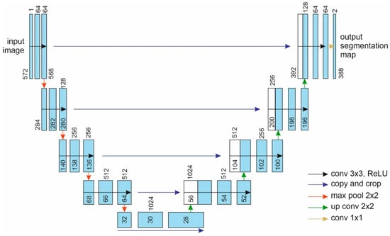 The general architecture of the basic U-Net neural network is shown in Figure 1 [18]. It is symmetrical and contains two main parts: the compression part, i.e., the encoder (on the left), and the expansion part, i.e., the decoder (on the right). The compression part is a typical architecture of a convolutional neural network, which contains repetitive convolutions with a 3 × 3 kernel, followed by the ReLU (rectified linear unit) and max pooling operations. With each downsampling, the number of feature maps doubles.