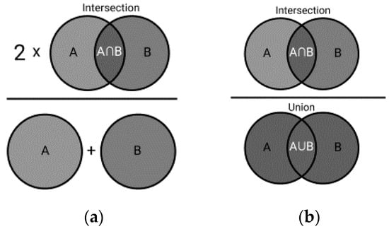 Calculation of segmentation quality metrics: Dice similarity coefficient (a) and Intersection over Union (b).