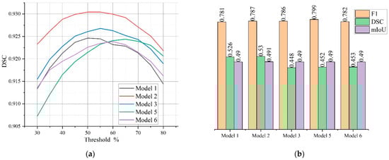 The SGD optimizer, learning rate , binary cross-entropy loss function and batch size 12 were used for training. Each model was tested on test images. Since the sigmoid activation function was used in the source layer of the classifier, the output value for each pixel was in the range of . This value can be interpreted as the degree of model confidence in the affiliation of a given pixel in the image to the defect, or as the defect severity: less noticeable defects usually correspond to smaller values, and vice versa. The final decision on the presence of damage is made if the output neuron value exceeds a certain threshold. Since the test metrics depend on the value of this threshold, they were calculated for a number of thresholds from 0.30 to 0.80, and the best one was chosen. The dependence of the metric on the threshold is shown in Figure 5a. Most of the maxima fall on the average range from 0.50 to 0.65, which indicates that the model adjusted to specimens provided during training. Comparative validation metrics of the same models are shown in Figure 5b.