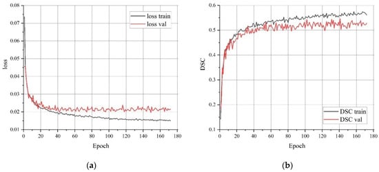 When training the neural network, its parameters were saved after each training epoch. When the loss function did not decrease over the previous 10 epochs, the learning rate was reduced by 20%. At the end of each epoch, the model was saved, as well as the training and validation quality metrics, such as DSC, IoU, precision, recall and F1-score. Training of a model was discontinued when the learning rate became less than 0.0001, or when the loss function did not improve its value over 20 epochs.