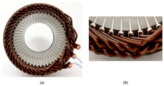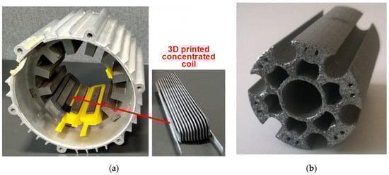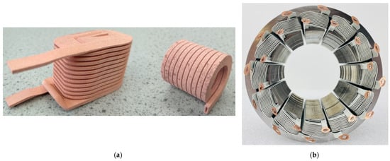 Concentrated coils made by AM technologies. (a) Samples made by laser PBF, reproduced with permission from the author of []; (b) coils used on a salient pole stator, reproduced with permission from the owner, Additive|Drives GmbH (Dresden) [].