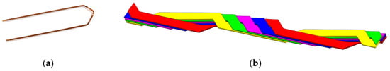 Hairpin stator windings. (a) A hairpin winding branch for low currents, reproduced with permission from the owner, Otto Bihler Maschinenfabrik GmbH & Co. KG (Germany) []; (b) half-bar comprising of five strands assembled upon the Roebel-transposition, which can be processed by AM [].